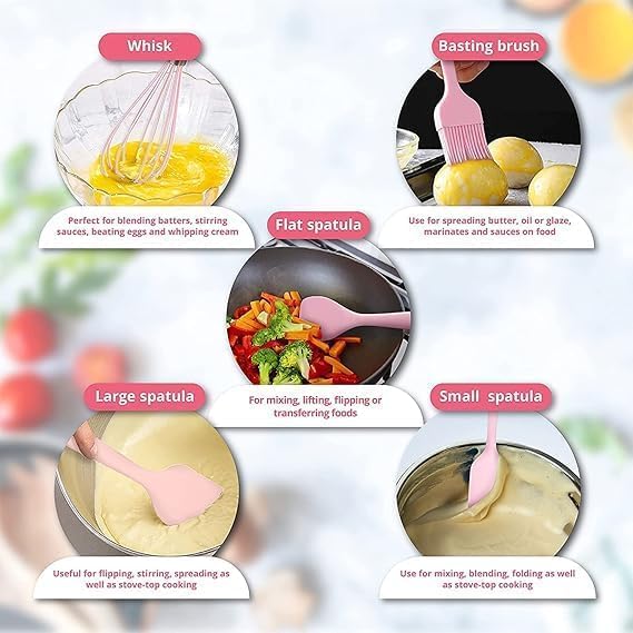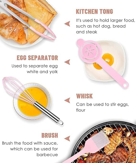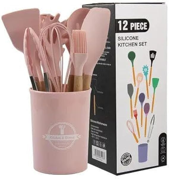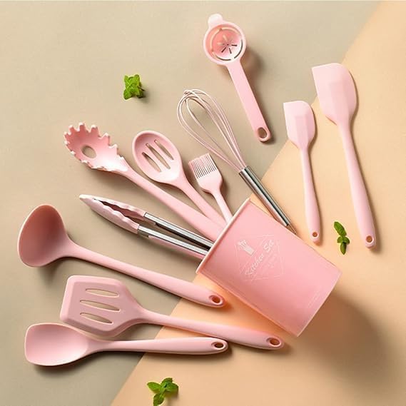Generic - Kitchen Utensils-12 Pcs, Silicone Cooking Utensils with Holder, Heat Resistant Nonstick Cookware, Includes Spatula, Tongs, Whisk, Brush, Slotted Turner (Pink)