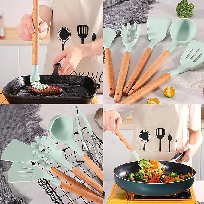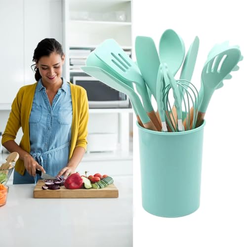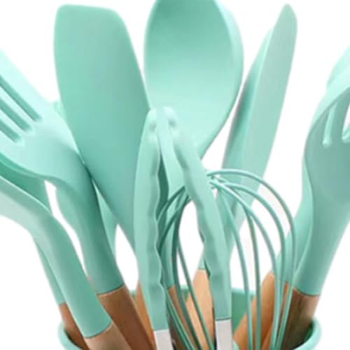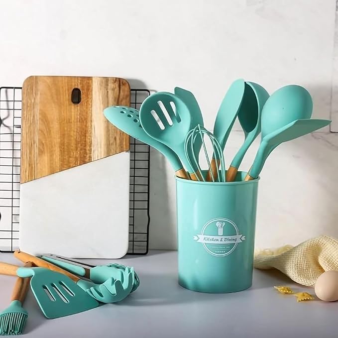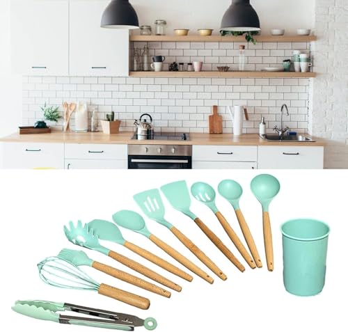 Generic - أدوات مطبخ، أواني طهي من السيليكون مع حامل، آمنة على الأواني غير اللاصقة ومقاومة للحرارة، تشمل ملعقة سباتولا وملقط ومضرب ومغرفة وفرشاة وملعقة مخرمة لتقليب الطعام
