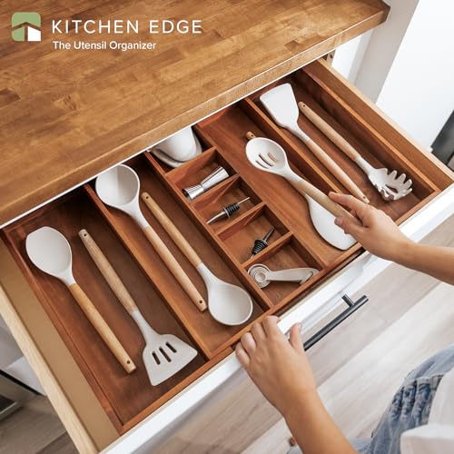 - BEAUTIFUL, DURABLE, AND WELL MADE - All KitchenEdge organizers use (a) solid wood construction to provide natural beauty, eco-consciousness, and strength, (b) robust acacia base with full perimeter support frame to ensure the organizer bottom won't sag & separate from the dividers when fully loaded down with contents, and (c) anti-slip rubber pads to prevent sliding around in the drawer.