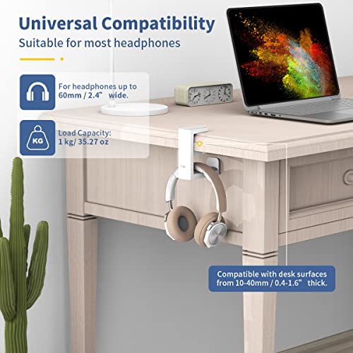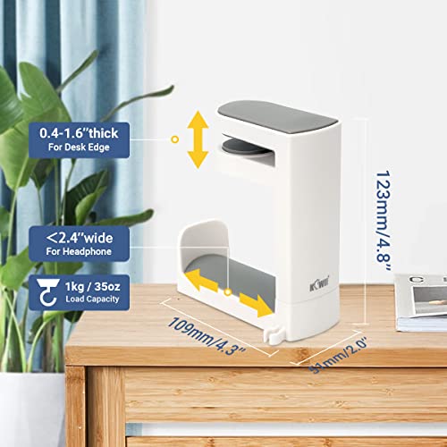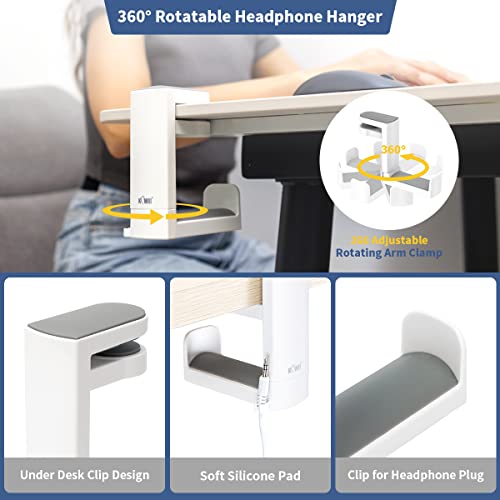 Kiwifotos - كيوي فوتوس حامل سماعة راس مع حامل سماعة راس دوار 360 درجة + مشبك زنبركي قابل للتعديل، حامل سماعة راس لسطح المكتب بمشبك سماعة راس للالعاب - ابيض