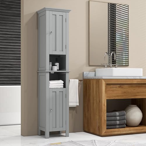 - Added Storage: This tall bathroom cabinet has 2 cupboards with doors and 2 open shelves, so you can store towels, daily hyginene products and cleaning supplies without trying to fit everything under the sink. There is an adjustable shelf inside the bottom cabinet which can be moved up and down to meet your different storage needs