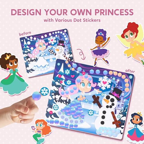 - Mess-Free Art: Say goodbye to glue and mess with our hassle-free dot stickers. Enjoy screen-free fun at home or while traveling, as these easy-to-use stickers adhere effortlessly to surfaces, ensuring a clean and enjoyable stickering experience.Delight kids with magical unicorns and enchanting princesses sticker art, adding fun to travel crafts for kids.