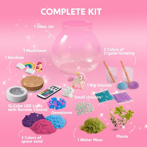 - COMPLETE UNICORN TERRARIUM SET: This complete set includes 3 colors of sensory play sand, a terrarium jar with lid and 12-color LED light, a light remote control, 1 large unicorn, 1 small unicorn, gemstones, 1 rainbow, 1 mushroom, 2 plant parts, 1 moss, 1 bag of foam balls and 2 sets of crystal growing materials. A magical activity that stimulates creativity and imagination!
