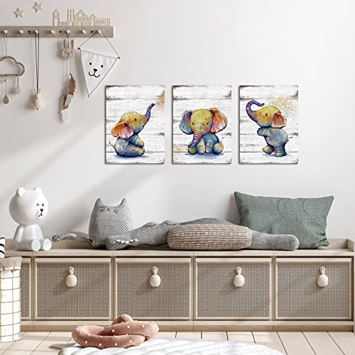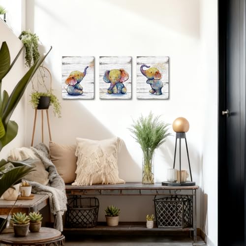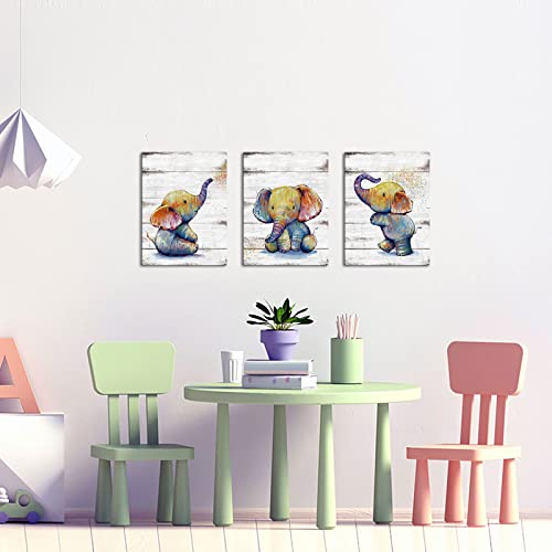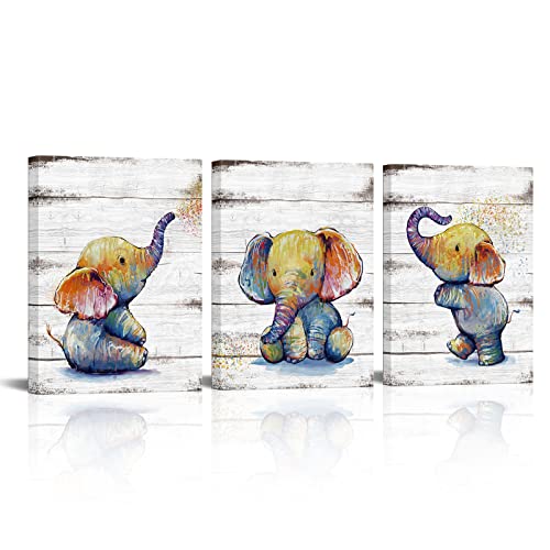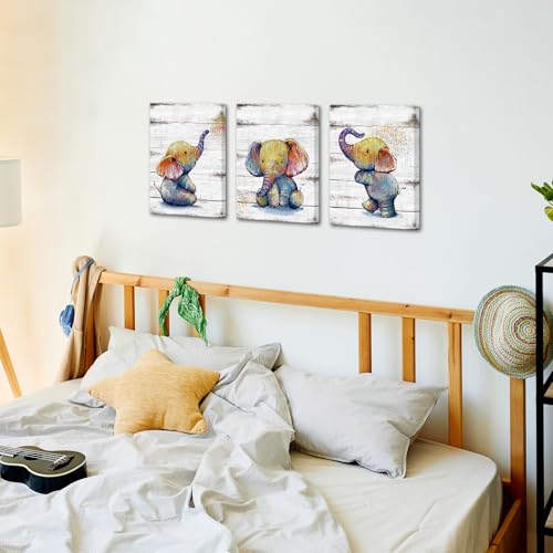 KLVOS - Funny Animal Wall Art Cute Elephant Baby Painting Picture Print on Wooden Background Framed and Stretched for Kids Baby Boy Girl Bathroom Bedroom 12x16inchx3PCS