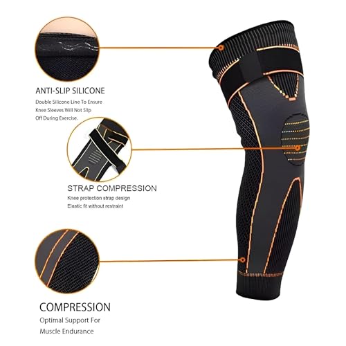 - These premium compression knee sleeves feature an innovative strap pressurization system and elastic braid technology, delivering targeted support that conforms precisely to your knee, helping to reduce pain, inflammation, and prevent injuries during various activities. Their sophisticated design with orange accent stitching not only offers style but ensures durability and a snug fit, making them suitable for daily wear, sports, or recovery routines with high comfort and stability.