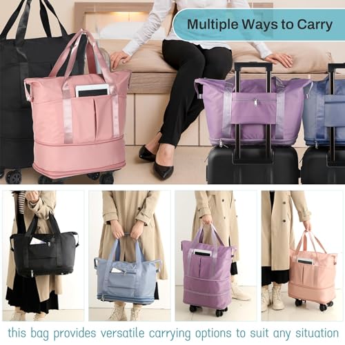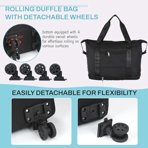 - 【Rolling Duffle Bag with Spinner Wheels】This wheeled duffle bag for travel is equipped with four detachable wheels at the bottom, which makes it easier to pull even on rough or uneven surfaces, allowing the carry-on duffel bag to move smoothly in any direction, making it easy to navigate through crowded airports, train stations, or busy streets. with 360° swivel wheels, you don't need to tilt or lift the travel bag, which reduces strain on your arms and shoulders during travel