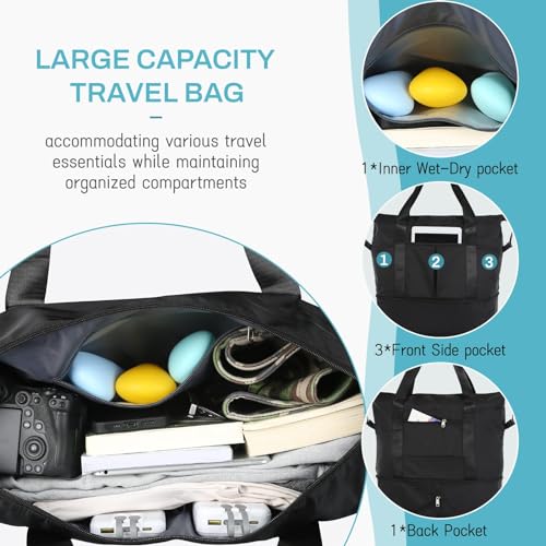 - 【Large Duffle Bag for Travel with Compartments】This weekend bag for women and men has 1 main compartment with 1 inner zip wet-dry pocket and 2 slot pockets, The main compartment provides ample space for your larger items and clothing. The inner zip wet-dry pocket allows you to keep wet or soiled items separate from the rest of your belongings, The slot pockets provide designated spaces for smaller essentials, making it convenient to access your passport, phone, keys, or any other small items