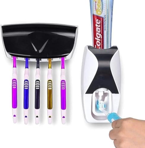 KOMRID - Color Toothpaste Dispenser Toothbrush Holder with Cover Toothpaste Dispenser Set Dustproof Wall Mounted for Washroom, Toothpaste Squeezer and 5 Toothbrush Holders Bathroom Organizer(Pack of 1)