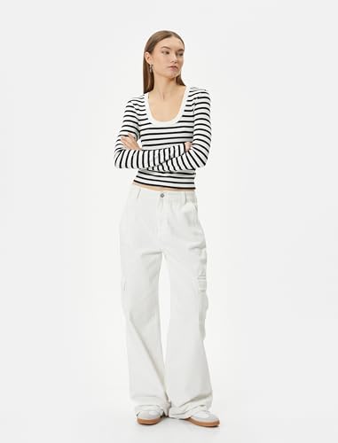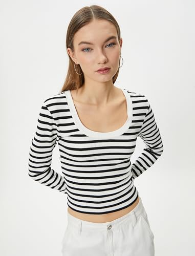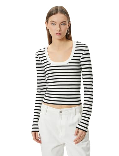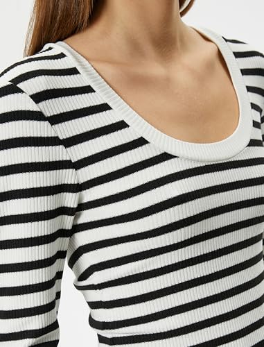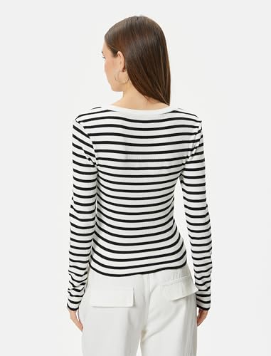 KOTON - تيشرت مضلع بقصة ضيقة سليم فيت ورقبة دائرية وأكمام طويلة للنساء من كوتون