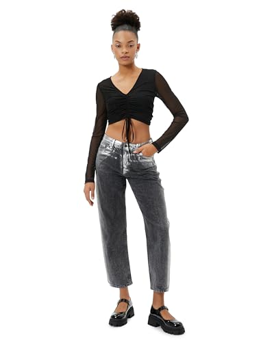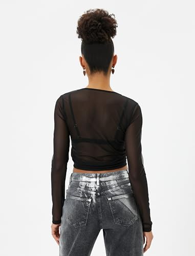 KOTON - KOTON womens Tulle Crop Draped Tie Detail V Neck Long Sleeve Tshirt