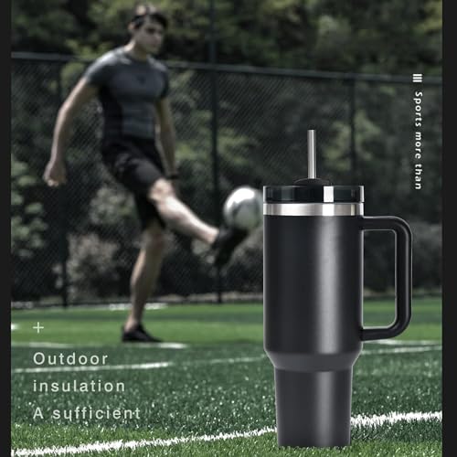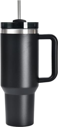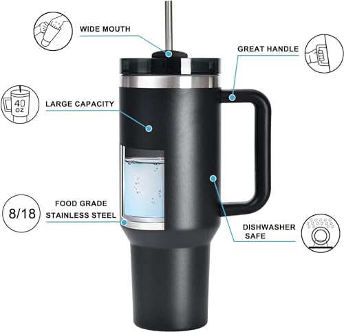 - 40 oz tumbler with handle and straw features double wall vacuum Insulated technology to keep your drinks COLD for up to 24 hours and HOT for up to 12 hours. No more putting ice cubes in the cup or worrying about sweaty drinks causing stains on the table.
