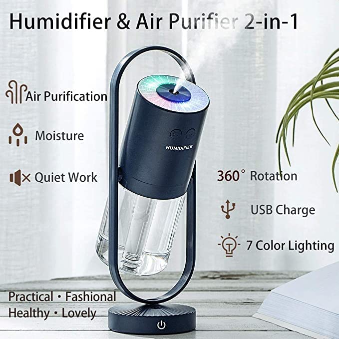 KRCIQMV - مرطب هواء محمول، منقي هواء قابل لاعادة الشحن 2 في 1 بزاوية قابلة للتعديل وخزان مياه سعة 260 مل بشحن USB، اضاءة ليد بـ7 ألوان لغرفة النوم والمنزل والمكتب (أزرق)