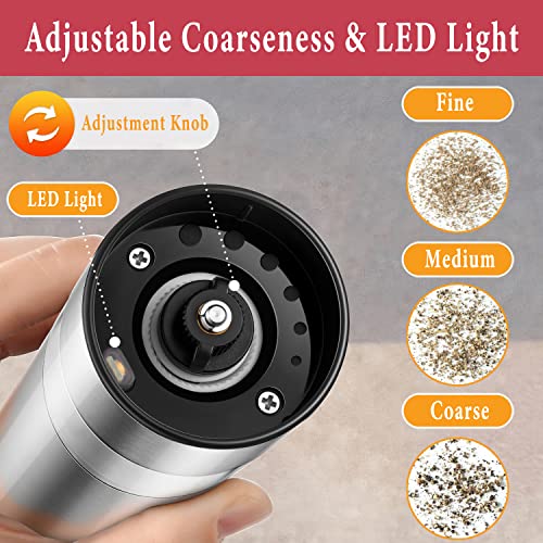 - Adjustable Coarseness: The electric salt and pepper grinder set allowing you to choose between a powdery fine to very coarse grind. and the electric pepper grinder mechanism produces even grinds at each coarseness setting