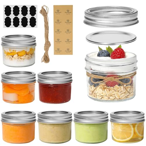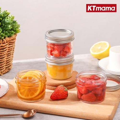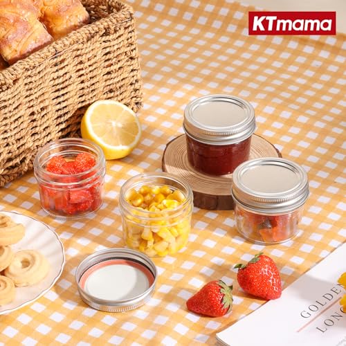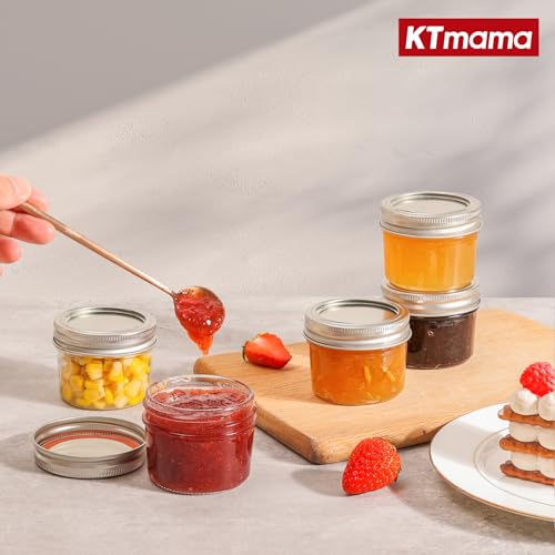 KTMAMA - برطمانات ماسون صغيرة مع اغطية سعة 4 اونصة - 8 قطع، برطمانات ماسون صغيرة واشرطة مانعة للتسرب، برطمانات تعليب زجاجية صغيرة للتوابل والمربى والعسل والجيلي والحلوى وهدايا الزفاف وحفلات الزفاف