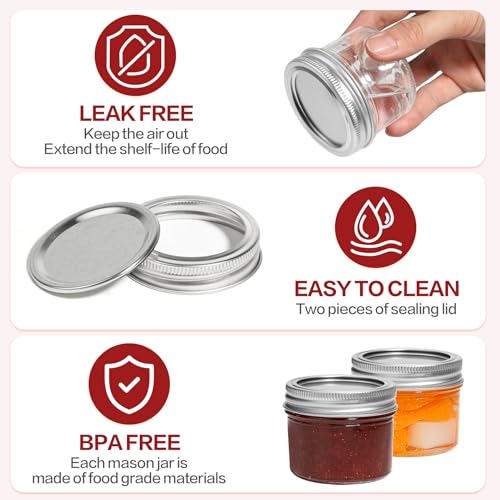- [حجم مريح] - اكتشف سحر برطمانات ماسون بسعة 4 اونصة! هذه البرطمانات الصغيرة هي الحجم المثالي لصنع أجزاء صغيرة مبهجة من المربى والجيلي المفضلة لديك. مثالية لأخذ العينات أو الإهداء أو الحفاظ على التحكم في الكمية.