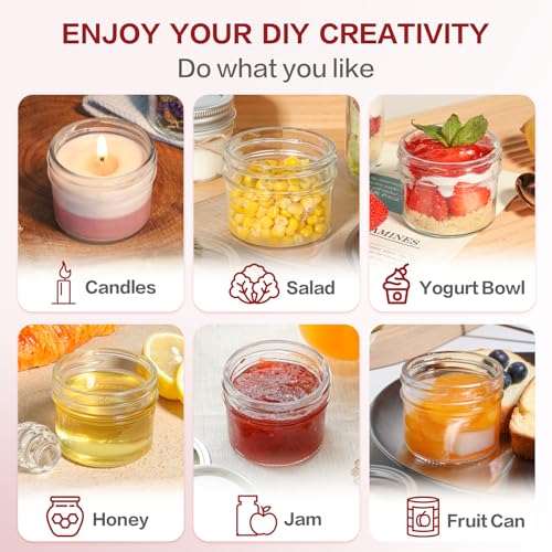 - [مشاريع الحرف اليدوية والصناعة اليدوية] - أطلق العنان لإبداعك مع برطمانات ماسون الصغيرة الخاصة بنا! بالإضافة إلى الحفاظ عليها، فإن برطمانات ماسون هذه بسعة 4 اونصة مثالية لجانبك الحرفي. ابتكر مشاريع يدوية ساحرة مثل الشموع المعطرة أو هدايا الحفلات المليئة بالوجبات الخفيفة أو حلول التخزين الصغيرة الرائعة. دع خيالك ينطلق!