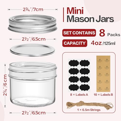 - [محتويات العبوة] - 8 برطمانات تعليب سعة 4 اونصة؛ 10 × ملصق "صناعة يدوية"؛ 8 × ملصق أسود؛ حزمة من حبل القنب بطول 6.5 متر. مع هذه الملحقات المجانية، يمكنك تنظيم البرطمانات الخاصة بك بشكل أفضل وتزيين هديتك بنفسك. نأمل أن تستمتع به!