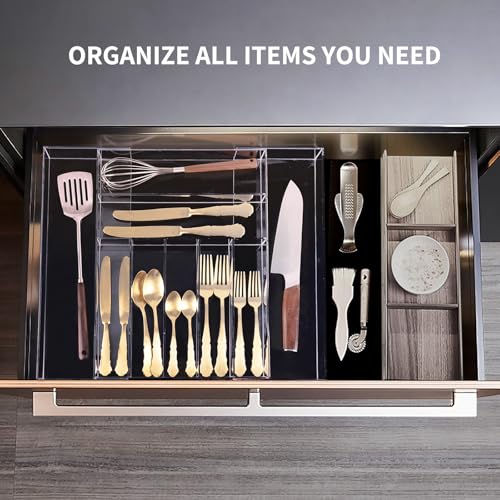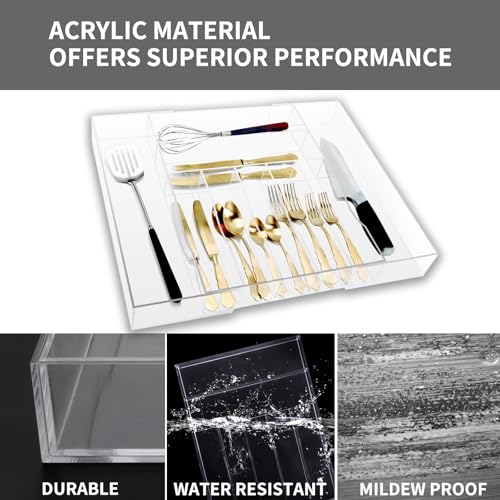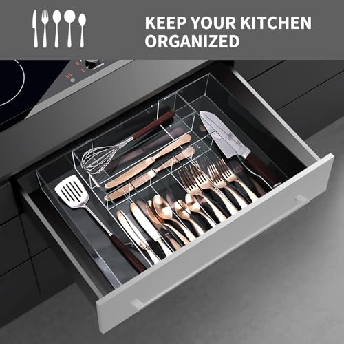 KTOTCKI - Clear Acrylic Drawer Organizer for Kitchen Utensils and Flatware, Adjustable Silverware Tray with 9 Compartments for Drawers, Office, and Bathroom Storage