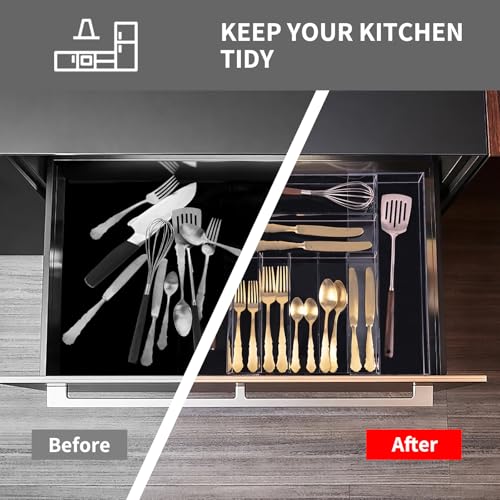- 【EXPANDABLE AND ADJUSTABLE】: Designed with 7 flatware compartments and two expandable sides, this utensil organizer offers additional storage space for your cutlery. It expands from 12” to 23” wide, easily fitting into most kitchen drawers, and can be adjusted to your drawer’s width for a customized and smooth experience.