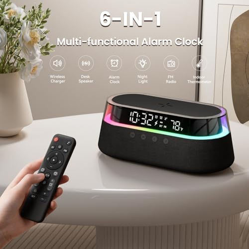 - Versatile 6-in-1 Alarm Clock: This alarm clock combines a 15W wireless charger, speaker, night light, digital clock, FM radio, and Thermometer into one compact device. It automatically syncs time with your connected devices for convenient setup. (When first plugged in, the device may not light up immediately, and the buttons may not respond. Please allow a few minutes for charging. Once the screen displays the clock, the device will be ready for normal use.)
