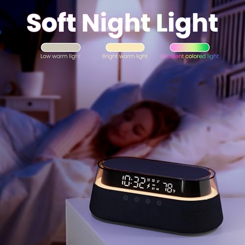 - Multi-Color Night Light with RGB Effects: Choose soft low or high brightness for reading, sleeping, or night-time lighting. This alarm clock with light also features RGB lighting modes. Sync dynamic RGB effects with music for a vibrant, relaxing atmosphere. To turn the light on or off, gently place your hand on the right side of the device for 3 seconds.