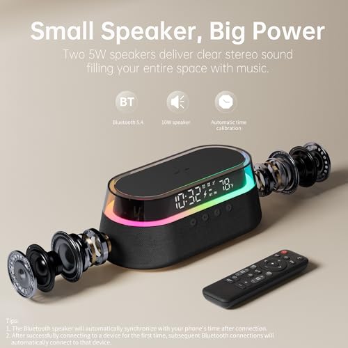 - High-Quality Dual Stereo Speakers: Enjoy exceptional sound quality with two 5W stereo speakers. Stream music wirelessly or via the AUX port, making it perfect for bedside use or as a portable computer speaker for immersive audio.