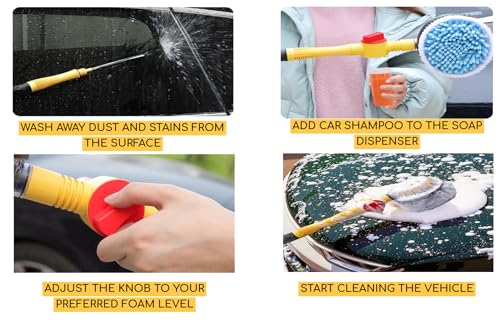 - 【Spray Foam】Simply adding car shampoo into soap dispenser, and adjusting the knob to desired foam level (3-gear adjustable), then the water flow will dilute and blaste the foam to car surfaces. No additional foam cannon required!