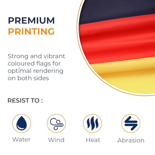 - Flag Germany: the German flag is a new premium version 2024. Professionally reinforced with double stitching around the edge, making the item more robust and durable. It can withstand a variety of bad weather conditions