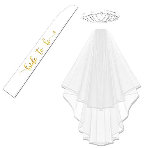 - This Pack Includes – 1X Glitter Rhinestone Bride Tiara( 5" diameter is comfortable and easy to wear) .1 X White Double Ribbon Edge Center Cascade Bridal Wedding Veil with Comb(30" Double veil with 2 inch clip). 1 X Gold Foil Bride To Be Satin Sash(Size:156CM / 61.4“×9.5cm / 3.7”)