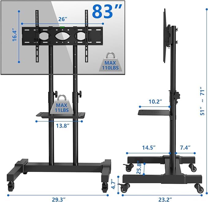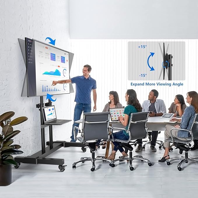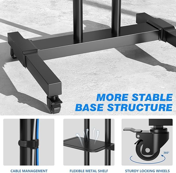 - 【STABILITY & MOBILITY】--This TV display stand is supported by 4 heavy-duty 360° swivel casters. There are 2 locking wheels on the front that can be fixed or moved as you wish. You can easily move your monitor or TV around your home or office. This TV stand on wheels is a great choice for video conferencing or presentations at trade shows, business, classrooms, computer games, hotels, shopping malls, entertainment centers and more.