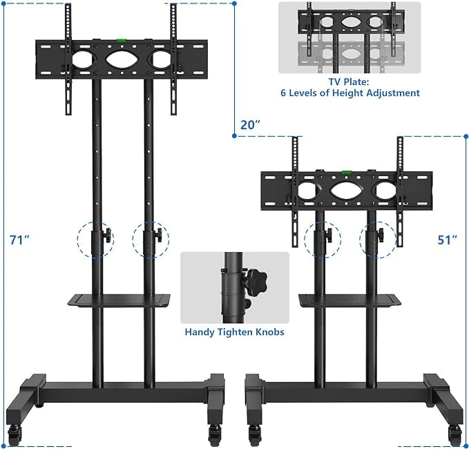 - 【Adjustable Height & Stand】--The height of this movable floor-standing TV stand can be adjusted from 51 inches to 71 inches for the best viewing angle. The height of its component metal tray rack is also adjustable from 5 inches to 32 inches, providing good space for accommodating computers, laptops, monitors, cable boxes, DVD players, streaming devices, and other equipment. It features a mesh design that increases airflow to your device, keeping it cool and preventing overheating.