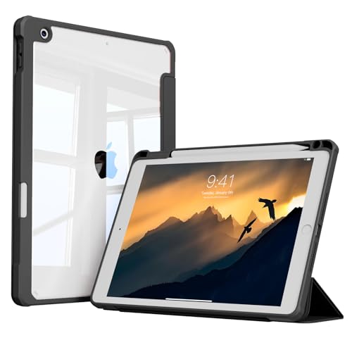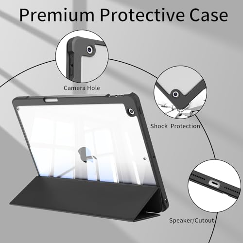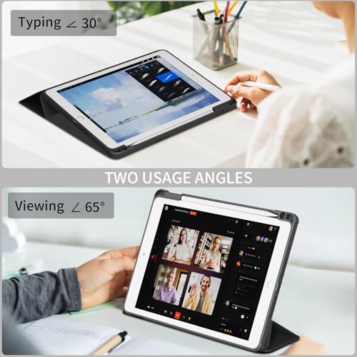 KVTVOU - Case for iPad 9th/8th/7th Generation (2021/2020/2019) with Pencil Holder, Slim Clear Triford Stand Case & Shockproof Soft TPU Frame Cover, Auto Wake/Sleep for iPad 10.2 Inch Case, Black