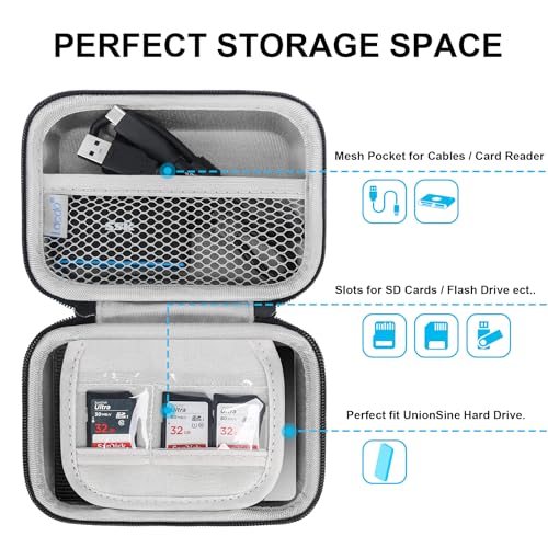 - ALL-IN-ONE TECH VAULT: No more tangles or lost gear! flexible elastic bands lock your UnionSine External Hard Drive in place, while the mesh pouch stores usb cables and other accessories. Hidden SD card slots (holds 4+ game memory cards!) and a padded divider turn chaos into order. Transforming this hard drive carrying case into an all-in-one travel organizer for photographers and tech enthusiasts.—finally, a case that thinks ahead!