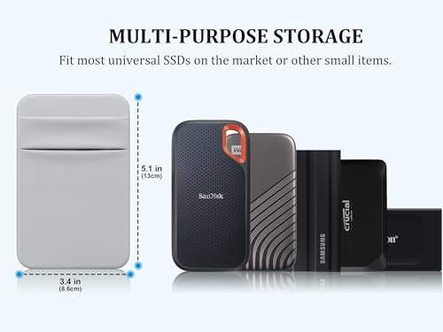 - حافظة تخزين خارجية لهارد SSD والاستخدام مع اللاب توب: يتمتع هذا المنتج بتصميم الجيبين لتوفير المزيد من مساحة التخزين، بحيث يمكن إضافة موقع إدخال الكابل. كما أنّ حامل الهارد المخصص للاب توب هذا مناسب لمعظم الهاردات الخارجية العالمية مثل سان ديسك اكستريم / اكستريم برو، سامسونج T7 شيلد / T7 / T9، كروشال X9/X10 برو SSD المحمولة أو بطاقة التوسيع من ويسترن ديجيتال_جراي وسيجيت.