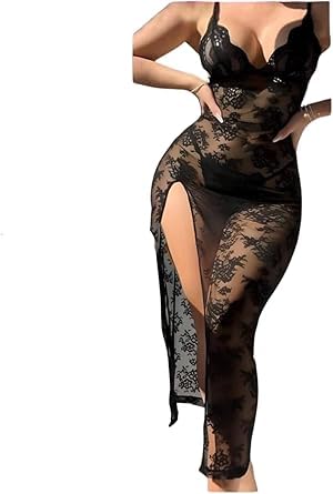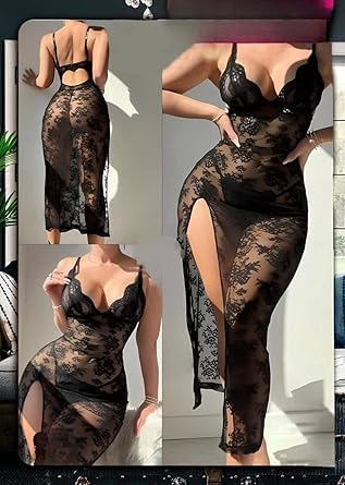 Generic - Lace Sheer Tulle Long Nightgown - Sexy Open Back Side Slit Lace Detail Lingerie