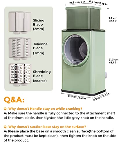 - [Safe to use] Our rotary cheese grater with handle keeps you away from sharp blades without touching the blades and never worrying about cutting your fingers again! The suction cup on the bottom lock to stay, firmly attached to the counter, which makes it convenient to operate, no sliding.