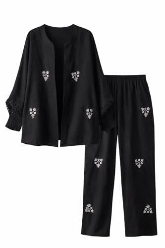 Generic - طقم اسود مصنوع يدويا من قطعتين للنساء من لاماساتي - بلوزة مفتوحة من الامام وسروال باستك عند الخصر مع طباعة بسيطة