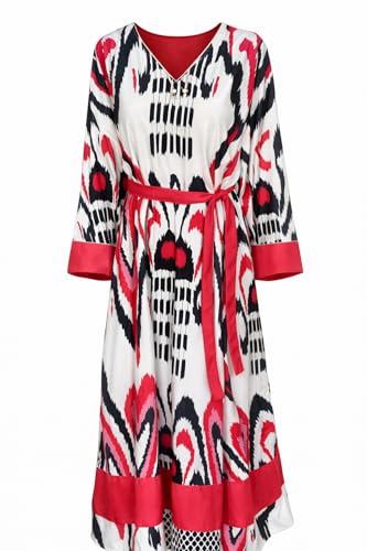 Generic - Lamasaty Women’s Printed Maxi Dress – Red, Black & White Patterned Modest Dress with Waist Belt (Size XL)