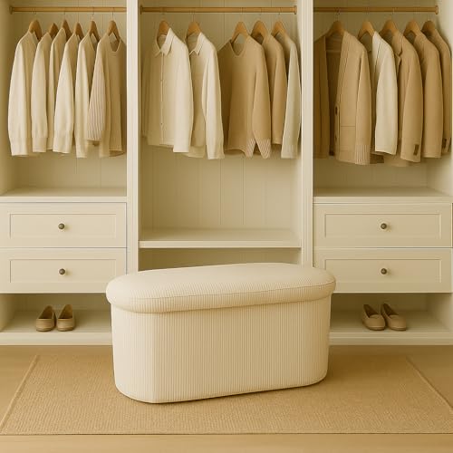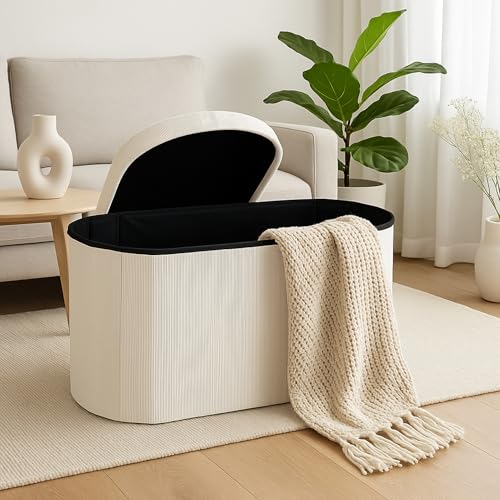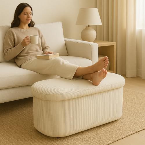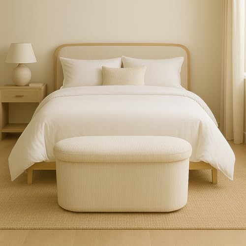 LAMBY HOME - Storage Bench – Corduroy Storage Pouffe, Bedroom Storage Chest, Folding Shoe Bench, Living Room Pouffe, Bench Footbed, Footstool Living Room and Sofa, White, 78 x 38 x 38 cm