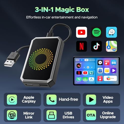 LAMTTO 3-in-1 Magic Video AI Box for Streaming Netflix/YouTube/TikTok, Wireless Carplay Adapter Dongle with USB Drive for OEM Wired Apple Car Play Cars