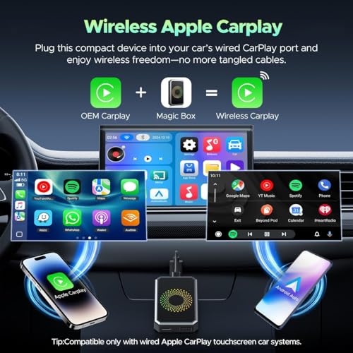 - 💡【Wireless Apple CarPlay】Take your drive to the next level! This wireless carplay adapter comes with Apple CarPlay. Just connect your phone, and boom—access your apps, maps, music, and more on your car’s touchscreen. With voice control, you can do it all—make calls, get directions, play music—without lifting a finger. no wires, no hassle, just pure convenience.(Note: Check if your vehicle supports CarPlay before buy.)