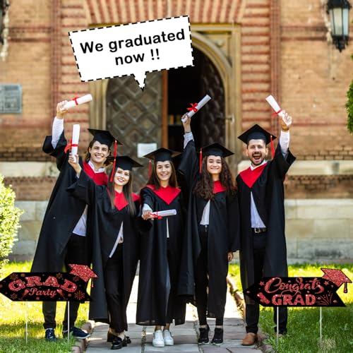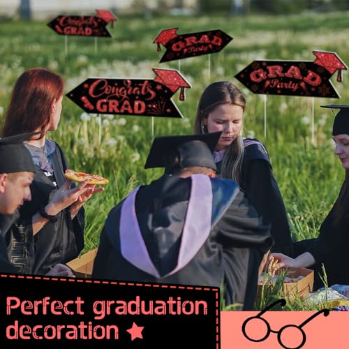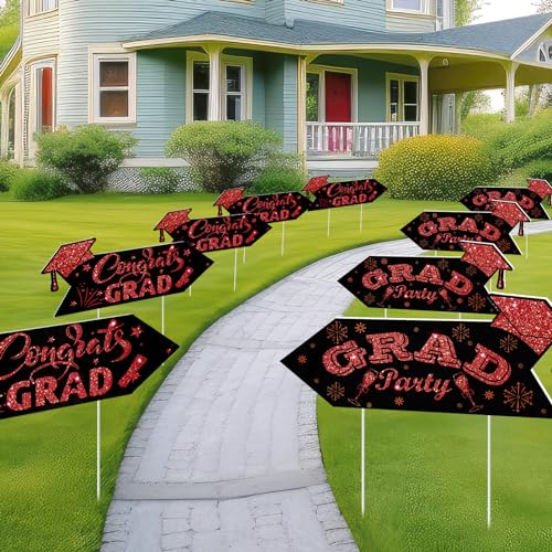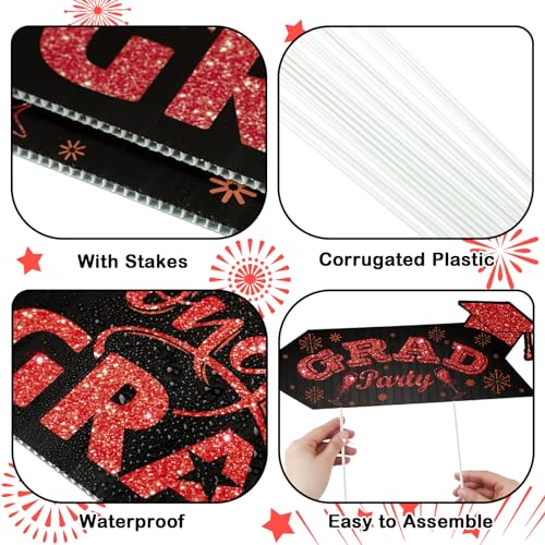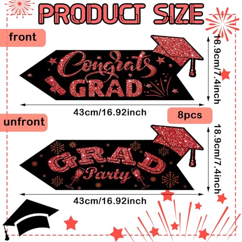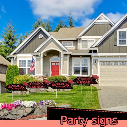 - Vibrant Visual Appeal: the black and red color scheme of these this way yard signs is sure to catch the eyes of your guests; The red section of each sign features an intriguing glitter print, enhancing its visual appeal; The signs feature a double sided printed design, with [ congrats grad] printed on one side and [ grad party] on the other side; Moreover, each design is graced with elements such as scrolls, graduation caps, and stars that enhance their appeal