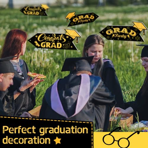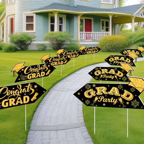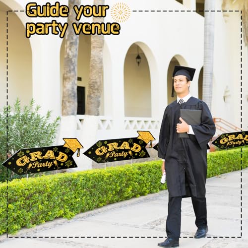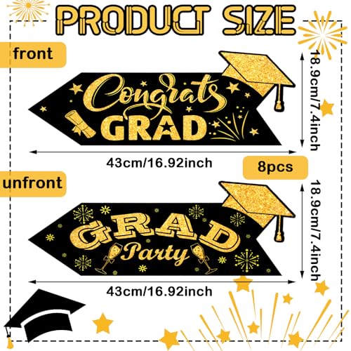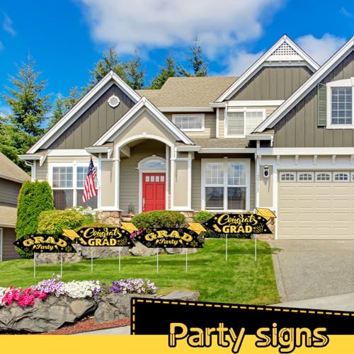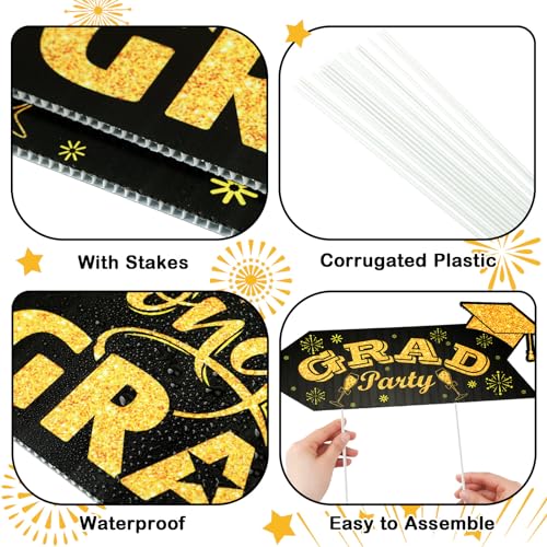 - Vibrant Visual Appeal: the black and gold color scheme of these this way yard signs is sure to catch the eyes of your guests; The gold section of each sign features an intriguing glitter print, enhancing its visual appeal; The signs feature a double sided printed design, with [ congrats grad] printed on one side and [ grad party] on the other side; Moreover, each design is graced with elements such as scrolls, graduation caps, and stars that enhance their appeal