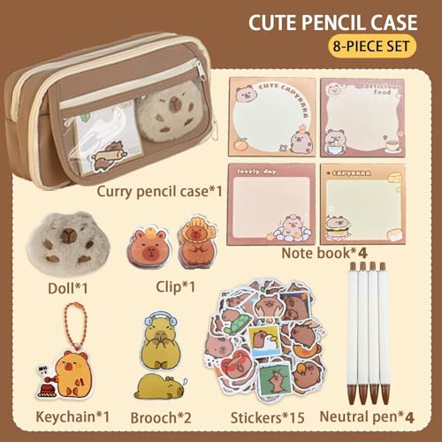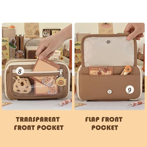 Langthering - مقلمة كابيبارا لطيفة، لوازم مدرسية كابيبارا، مقلمة جمالية شفافة مع دبابيس كابيبارا لطيفة وقطيفة، حافظة أقلام متعددة الطبقات بسعة كبيرة من لانجثيرينج، لون بنى، عادية
