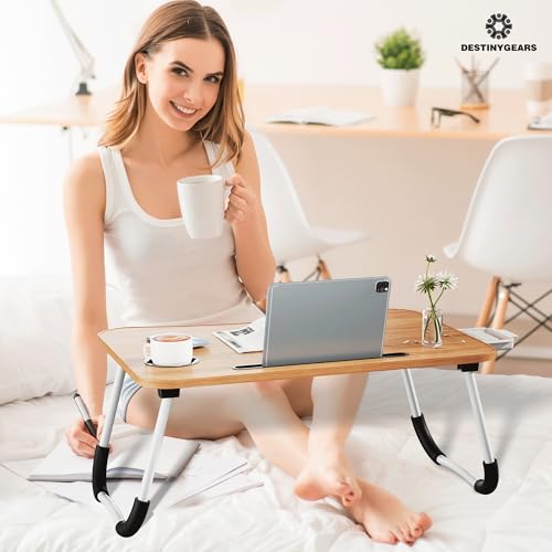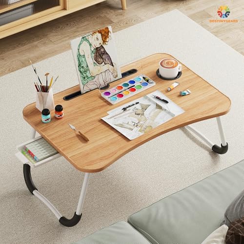 DESTINYGEARS - طاولة مكتب لتناول الطعام وحمل اللاب توب والإفطار في السرير، للكنبة والمذاكرة والقراءة والكتابة مع حامل أكواب، طاولة منخفضة محمولة وقابلة للطي، لون بيج (Walnut Beige)