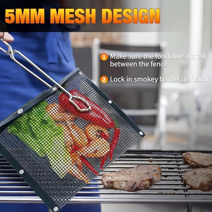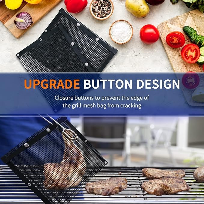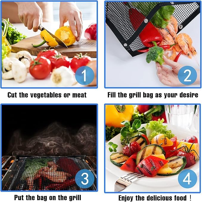 - MULTI-PURPOSE-Our barbecue grilling mesh bags 2 set are suitable for electric, gas and charcoal grills as well as ovens. Outdoor mesh grill bags for grilling veggies,vegetables, fish, meat, shrimp,mushrooms, onions or anything else you like. The mesh design ensures you get the perfect amount of charcoal and smoky flavor every time. Unlike aluminum foil grill bags, these non-stick mesh grilling bags for outdoor grill bags will allow you to have perfect visibility while cooking your food.
