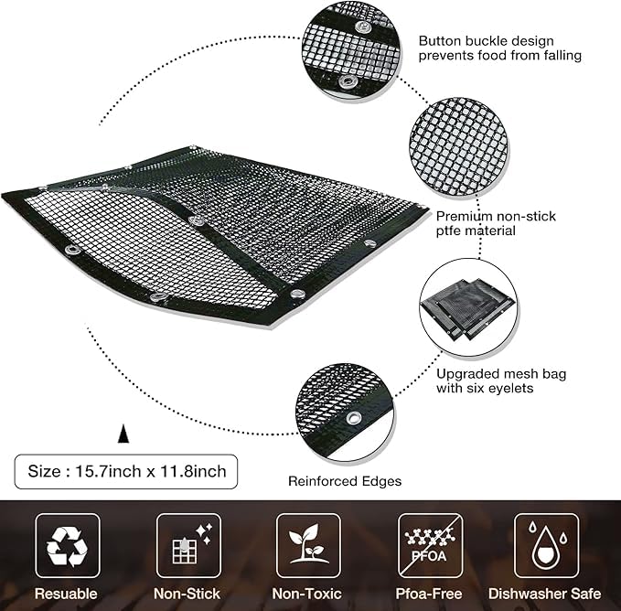 - HIGH QUALITY EXTRA LARGE BBQ GRILLING POUCH- Non-stick mesh grill bag x 2 set. Grill bags Size: (XL)15.8 x 11.8 Inch. Premium Material: Flexible PTFE Fiberglass coating. BBQ mesh grill bags safe Heat Resistant up to 500℉.Will not Melt, Burn, or Deform. Safe and health. Doesn't contain any PFOA, silicone and don't produce any harmful substances to the human body.