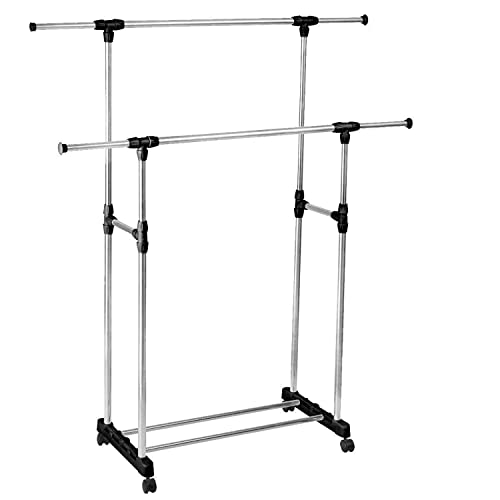 Spaceshoop - Large double-pole clothes hanger, garment drying rack with rolling wheels, adjustable bars (stainless steel poles)
