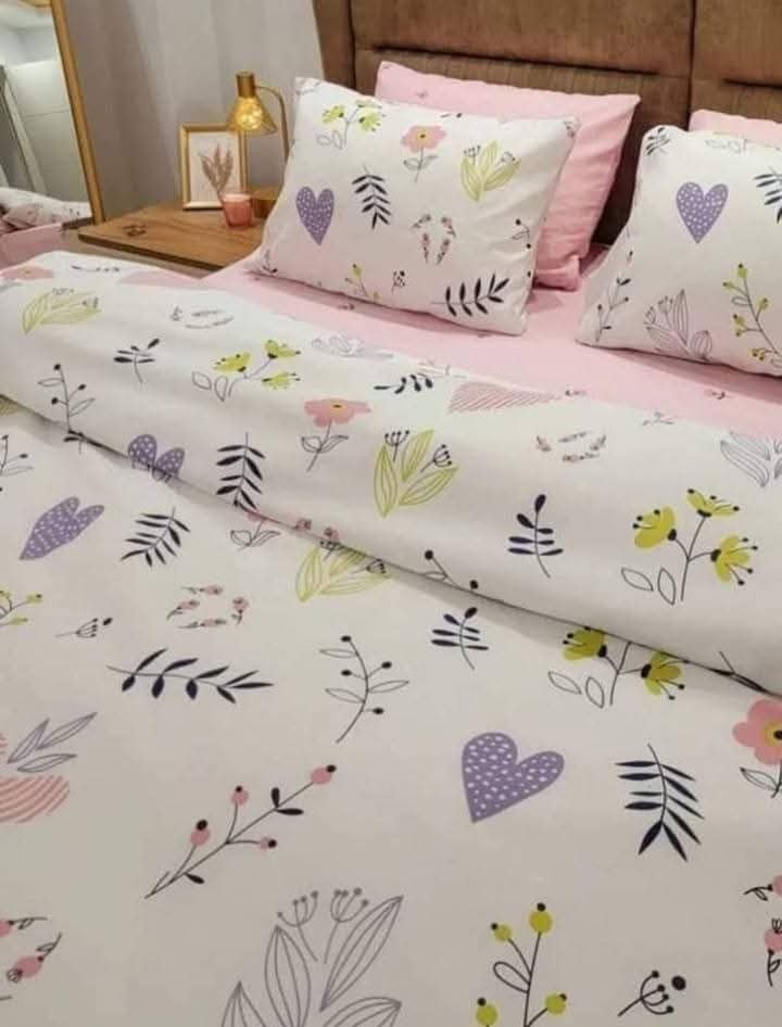 - تصميم زهري أنيق: يتميز بنقوش زهور ملونة وقلوب وأوراق نباتية على خلفية بيضاء مع تفاصيل وردية لإضفاء لمسة عصرية على غرفة النوم