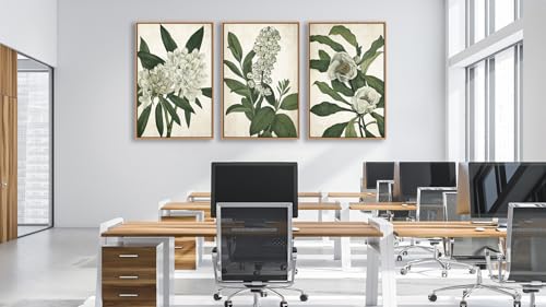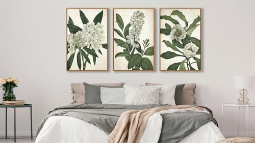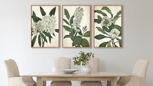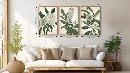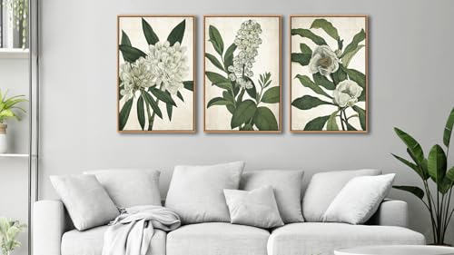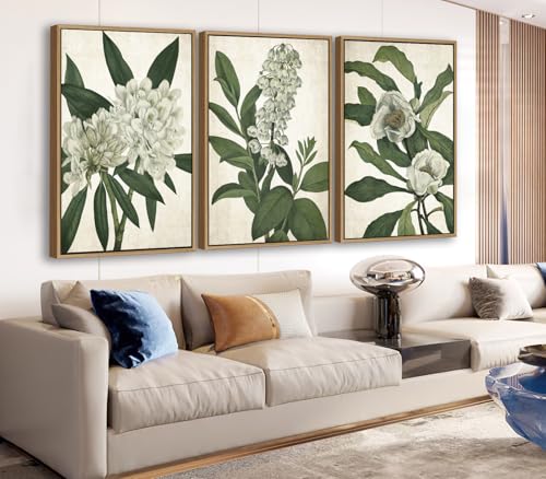 linglingdog - Large Framed Wall Art - Natural Float Framed White Flowers Green Leaves Canvas Pictures Decor Simple Botanical Plants Artwork for Living Room Bedroom Kitchen Home Office Decoration 60" X 28" Set of 3